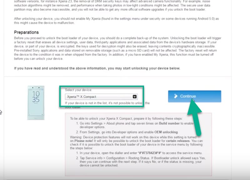 2. Pilih tipe smartphone Sony Xperia anda, setelah selesai pilih continue.