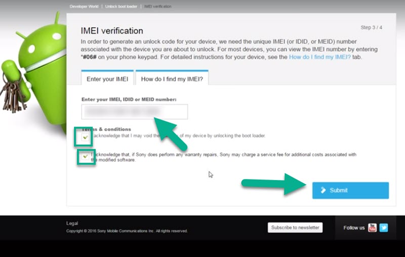 5. Masukkan nomor IMEI dari smartphone sony xperia anda, untuk menampilkan nomer IMEI anda bisa melakukan dial *#06#. Seletah selesai pilim submit